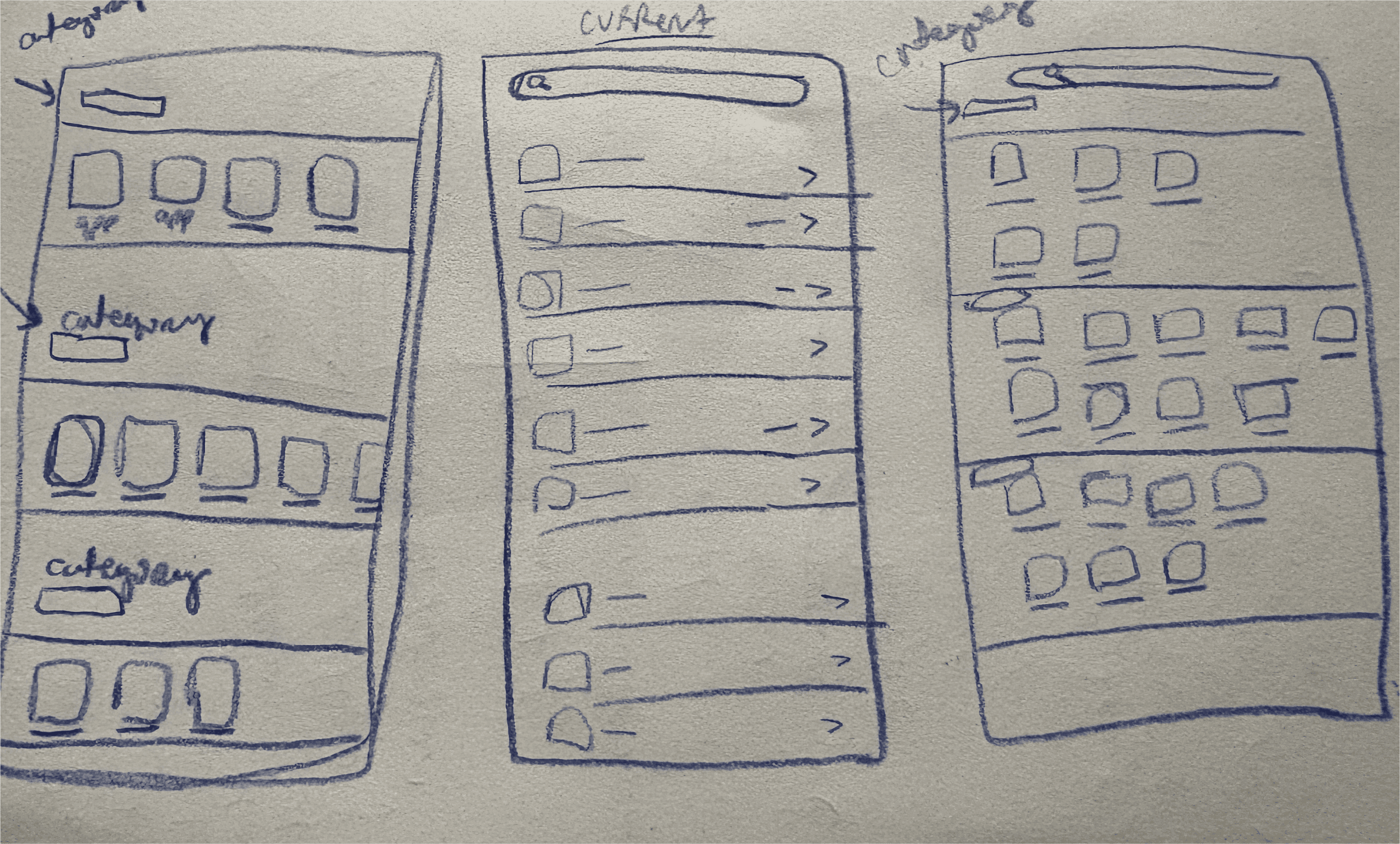 These six low-fidelity sketches explore alternative navigation models for app settings, including horizontal scrolling, folded vertical drawers, icon-based groupings, and card galleries.