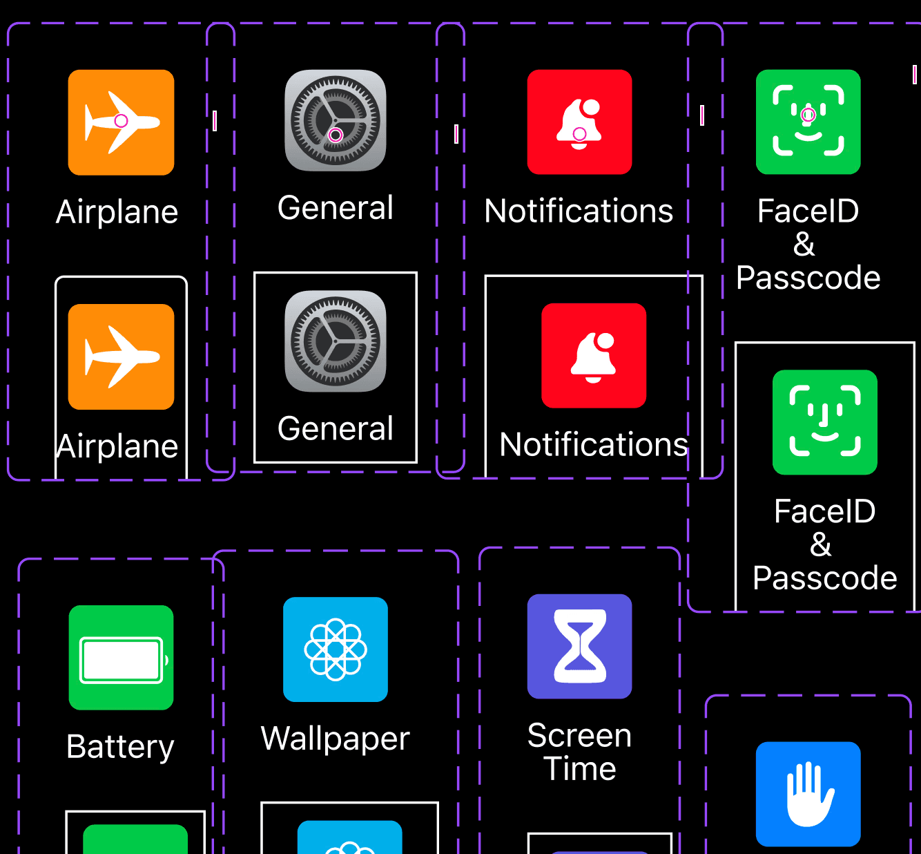 I prototyped only the singular-column/row sketches. Multi-column designs would create an unfair comparison to the default list format of the iOS settings menu.
