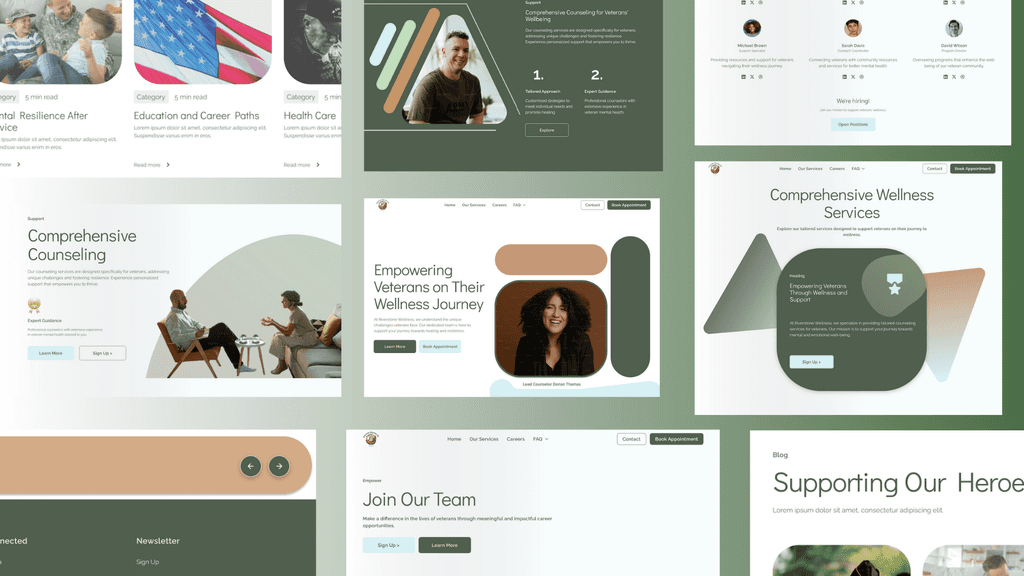 I began by researching accessibility needs common to veterans and mental health clients. I followed this with a brief competitive analysis of similar counseling websites, utilizing these insights to prompt Relume’s AI to generate a user-focused page hierarchy, which I refined with a calming veneer that reflects the client’s vision.