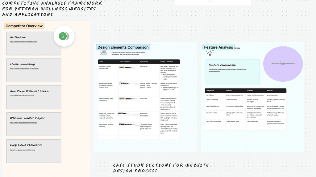 I conducted a competitive analysis of five websites: the Wounded Warrior Project, Gary Sinise Foundation, two counseling service landing pages, and a wellness center. These sites offered a focused view of veteran-centered and wellness-driven experiences. The analysis revealed gaps in accessibility, overwhelming option sets, inconsistent button navigation, and limited support for users with cognitive or motor impairments. These insights informed opportunities to create a more streamlined, inclusive, visually distinctive experience.