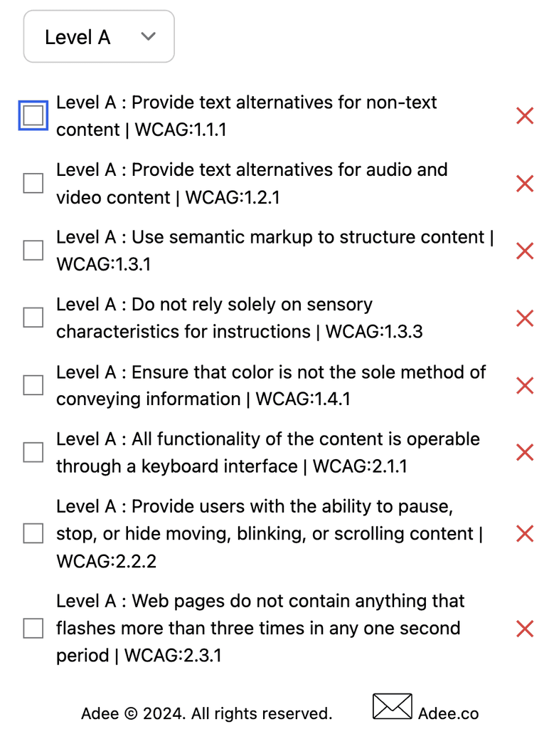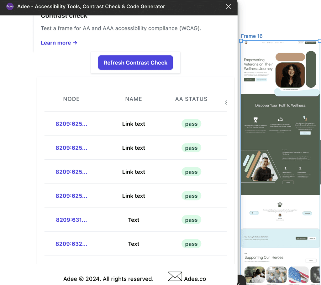 I used the Adee accessibility tool’s contrast checker to ensure all text met color contrast standards for readability. This helped validate that font sizes, weights, and background pairings supported legibility across the interface, particularly for users with visual impairments.